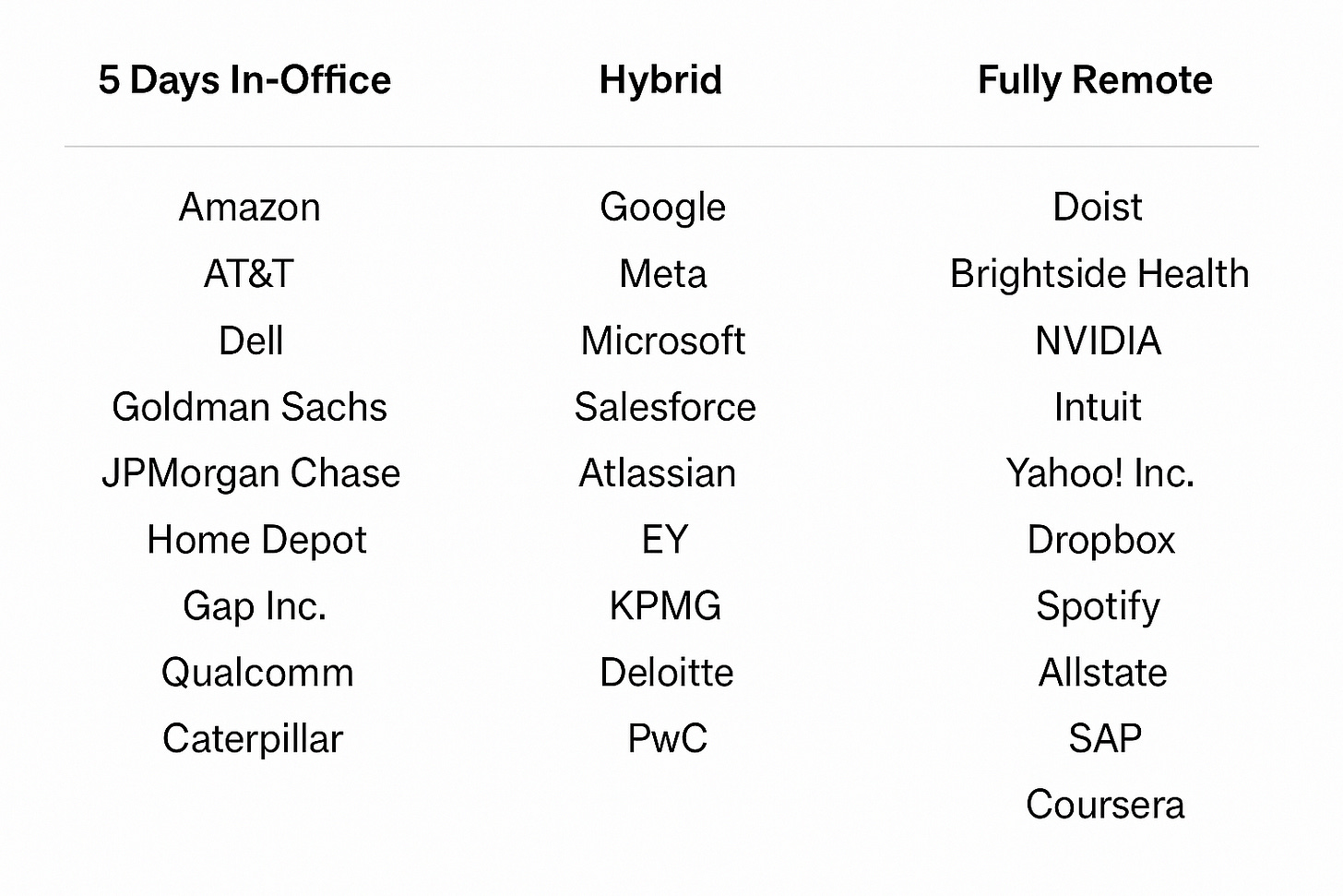 Many companies do some variant: common in-office days, sometimes centered around team needs, or all-hands meetings. I’ve heard some firms refer to Wednesday as the “collaboration day” company-wide, keeping Mon/Fri remote for focus or personal flexibility.